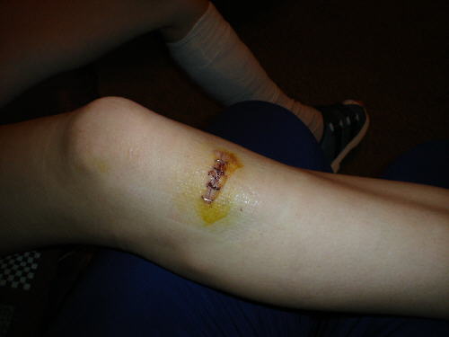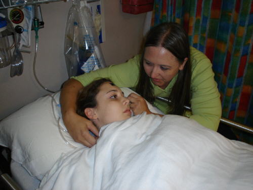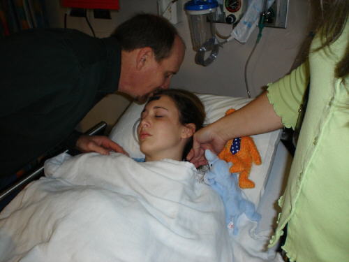daddy's kissing hannah as she wakes up from her right knee and left ankle surgery. |