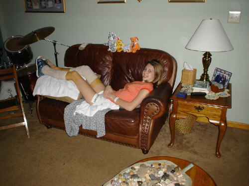 daddy's kissing hannah as she wakes up from her right knee and left ankle surgery. |